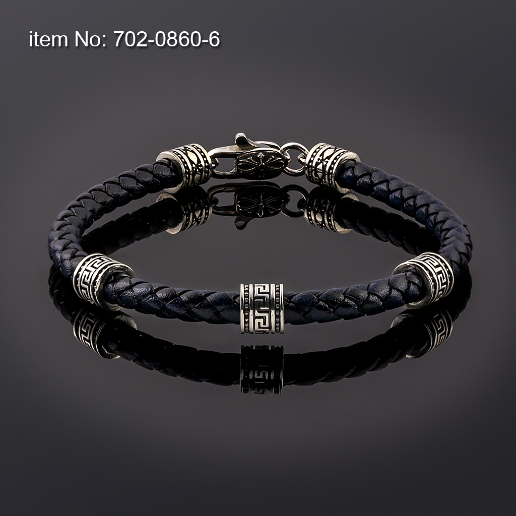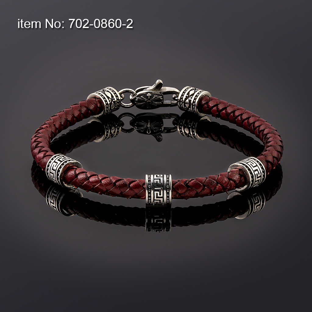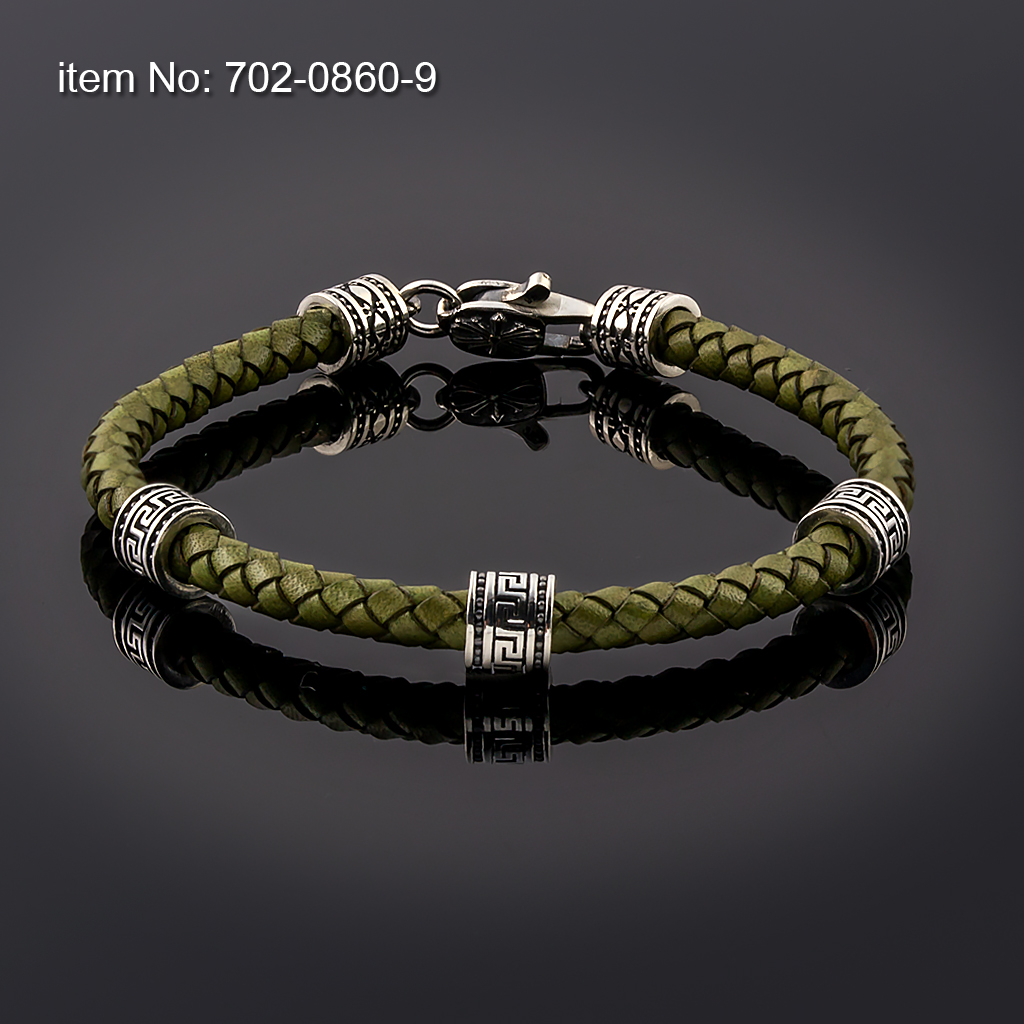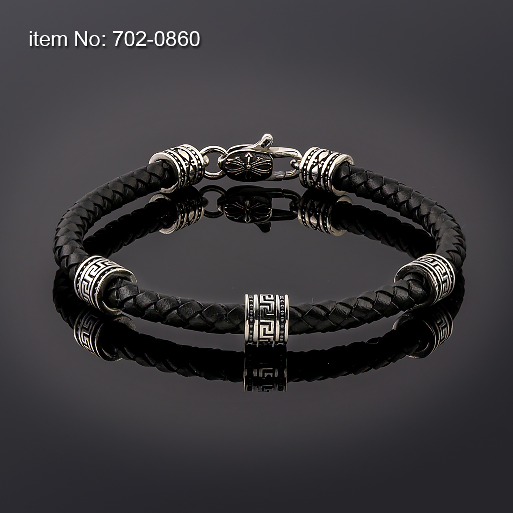 925° Ασημένιο βραχιόλι με μοτίφ γκρέκα & γνήσιο πλεκτό δέρμα - Πατήστε εδώ για περισσότερα χρώματα -