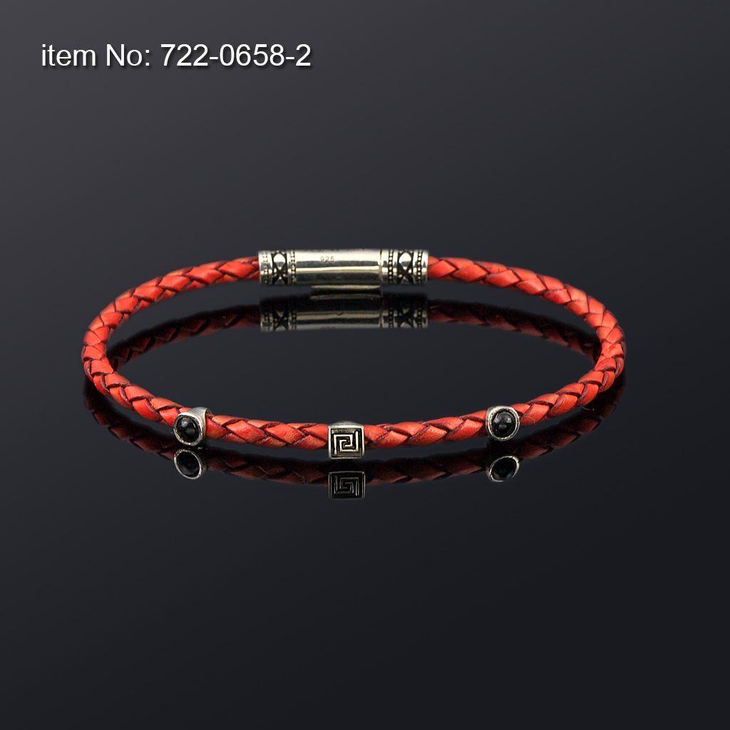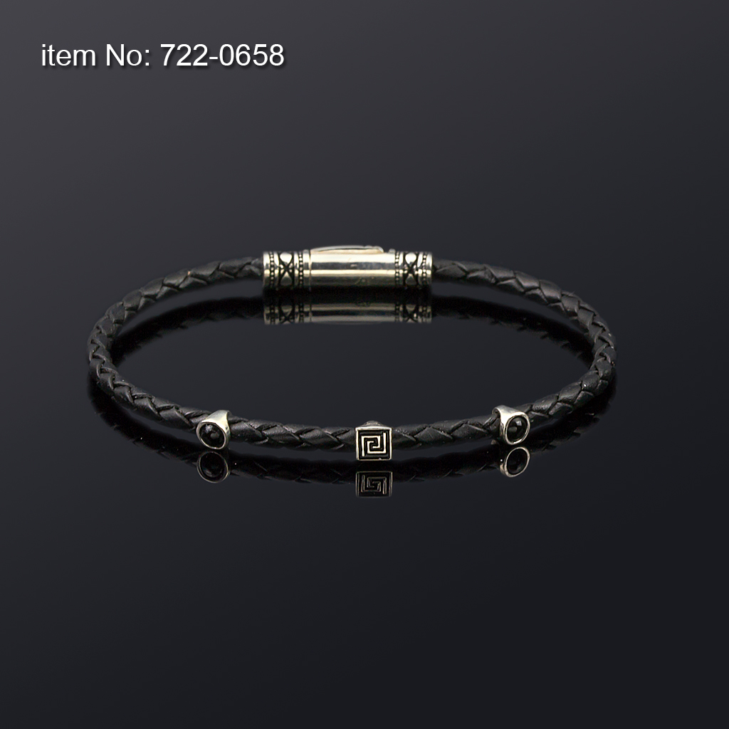 Sterling silver bracelet with Meander, agate motif and black antique genuine leather 3 mm