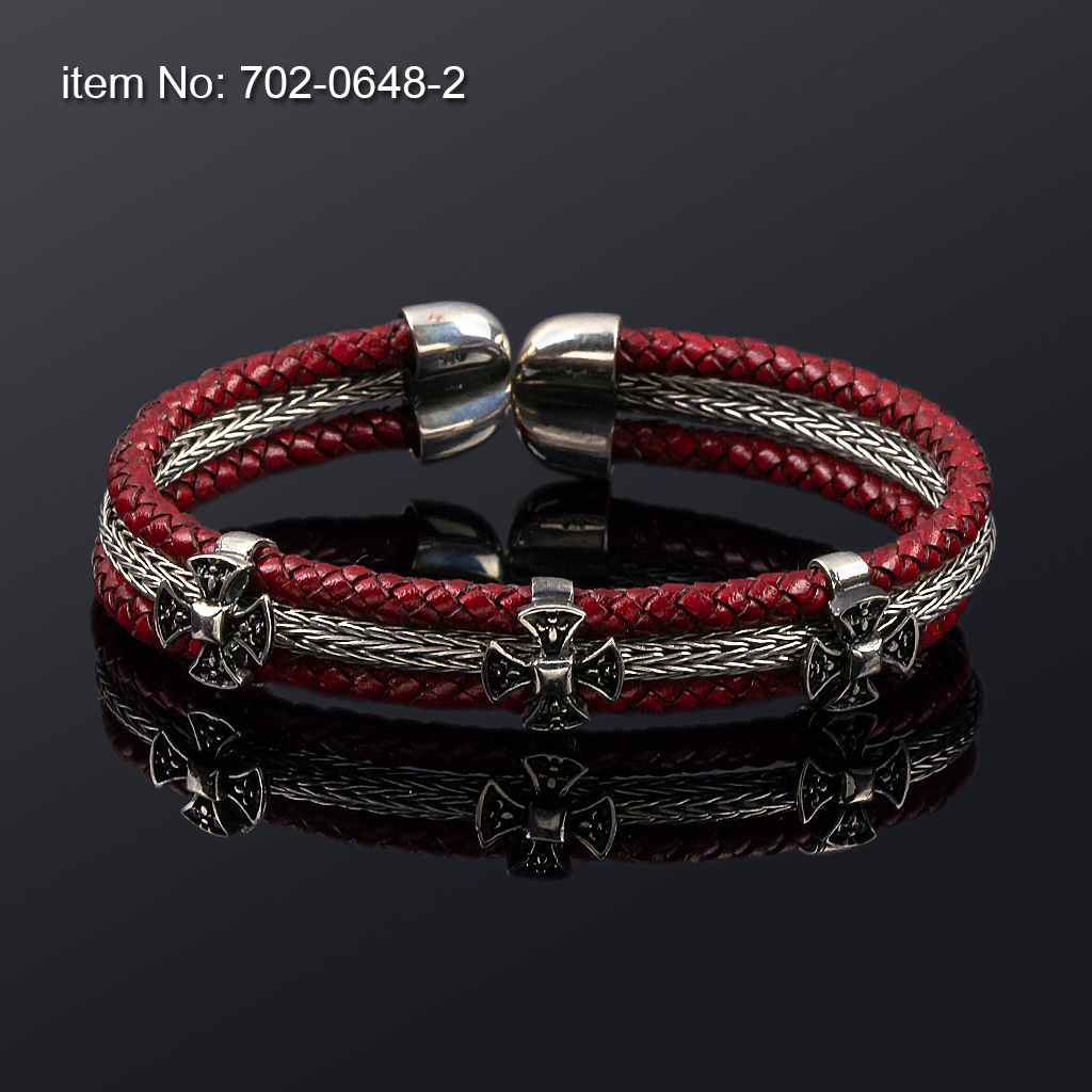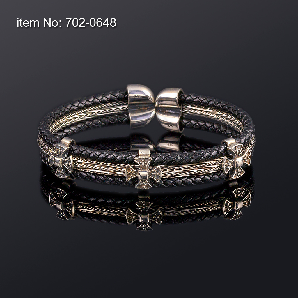 Ασημένιο flex βραχιόλι με μοτιφ (12 mm φάρδος), και με γνήσιο μαύρο δέρμα
