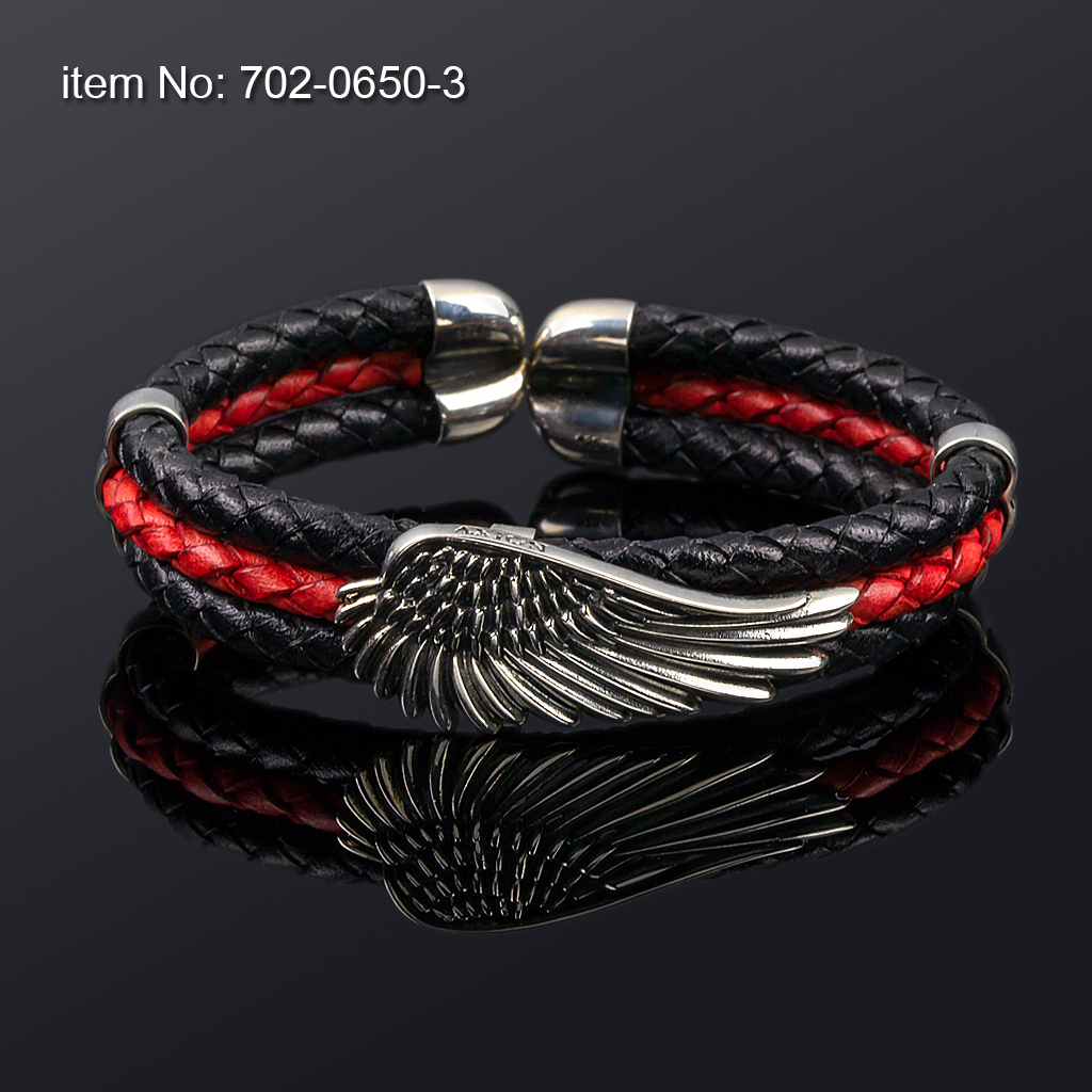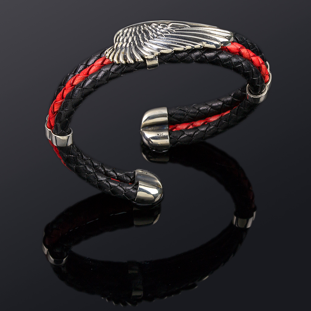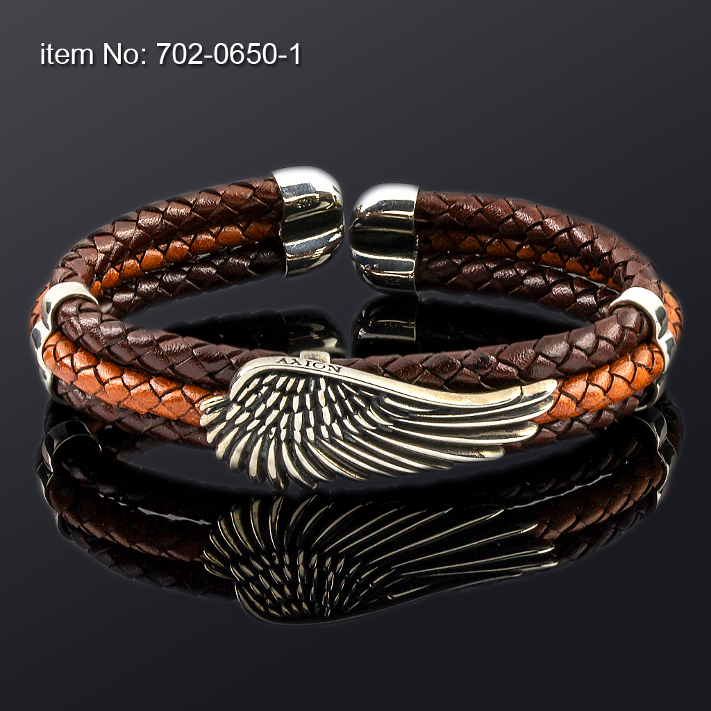 Ασημένιο Flex Βραχιόλι 925° με φτερά αγγέλου (19mm width) και γνήσιο καφέ δέρμα - Πατήστε εδώ για περισσότερα χρώματα -