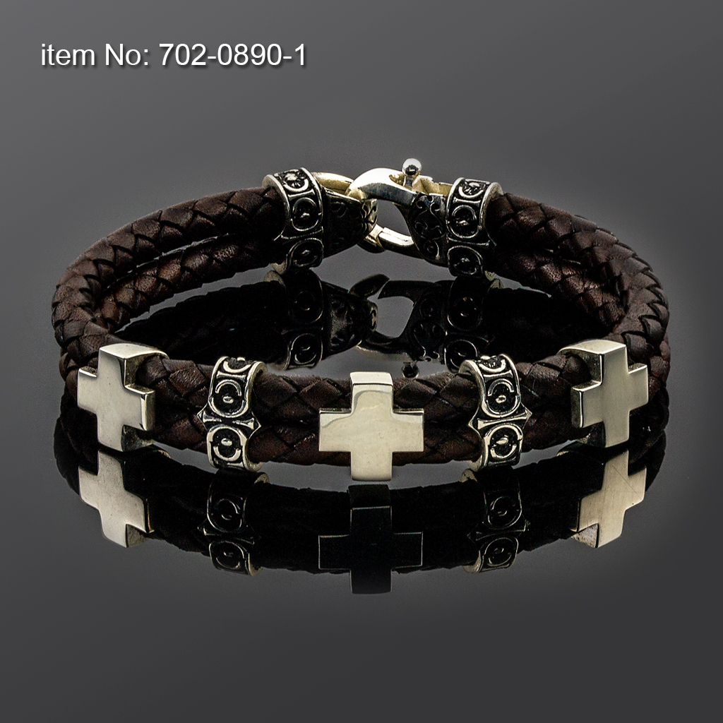 Bracelet with Sterling Silver Crosses motif and braided genuine leather