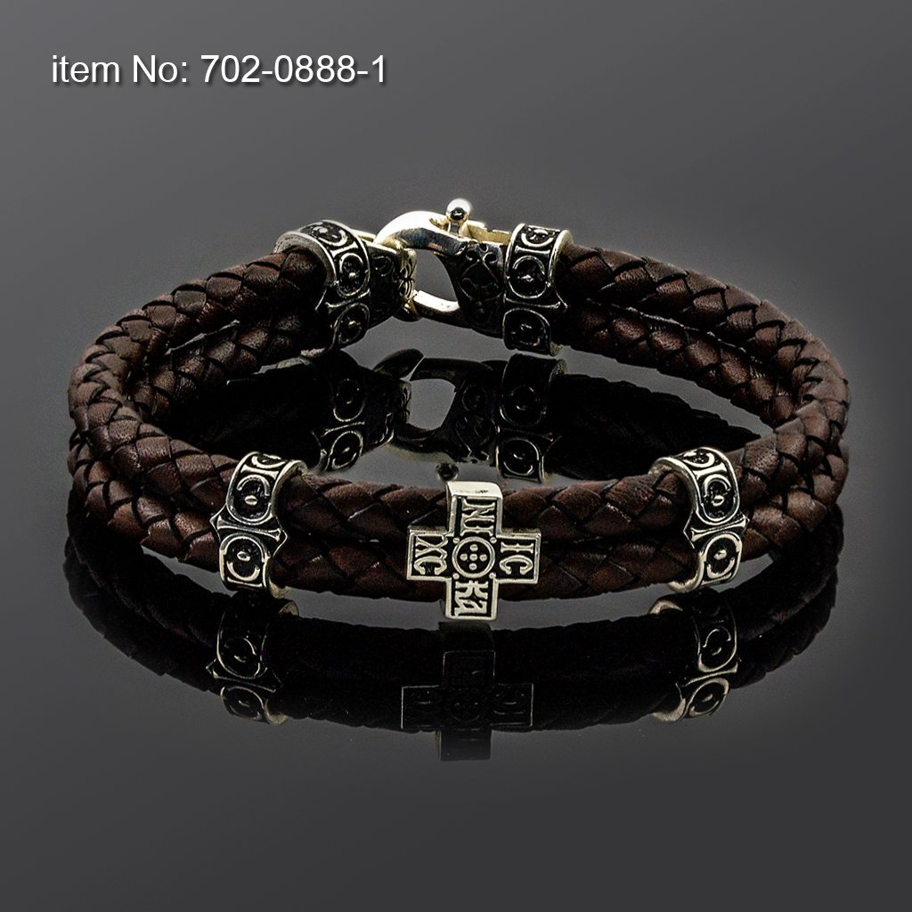 Ασημένιο βραχιόλι με μοτίφ Σταυρό και με γνήσιο πλεκτό δέρμα