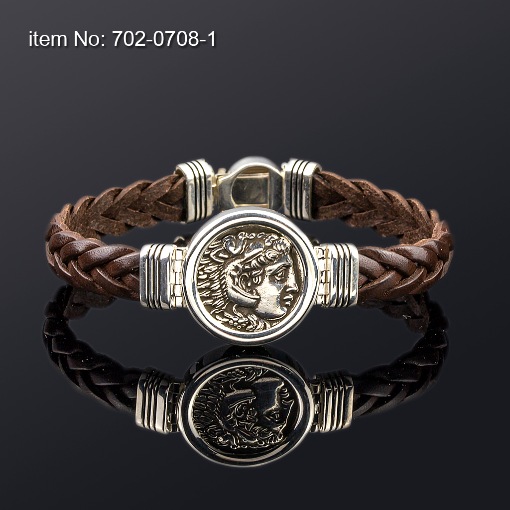 Ασημένιο Βραχιόλι 925° με μοτίβο νόμισμα Μ. Αλέξανδρος 22mm και γνήσιο πλεκτό καφέ δέρμα 10mm