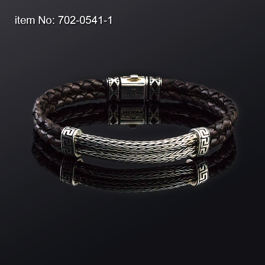 Ασημένιο βραχιόλι με μοτίφ μαιάνδρους, διπλή πλεχτή αλυσίδα και διπλό γνήσιο πλεχτό καφέ δέρμα