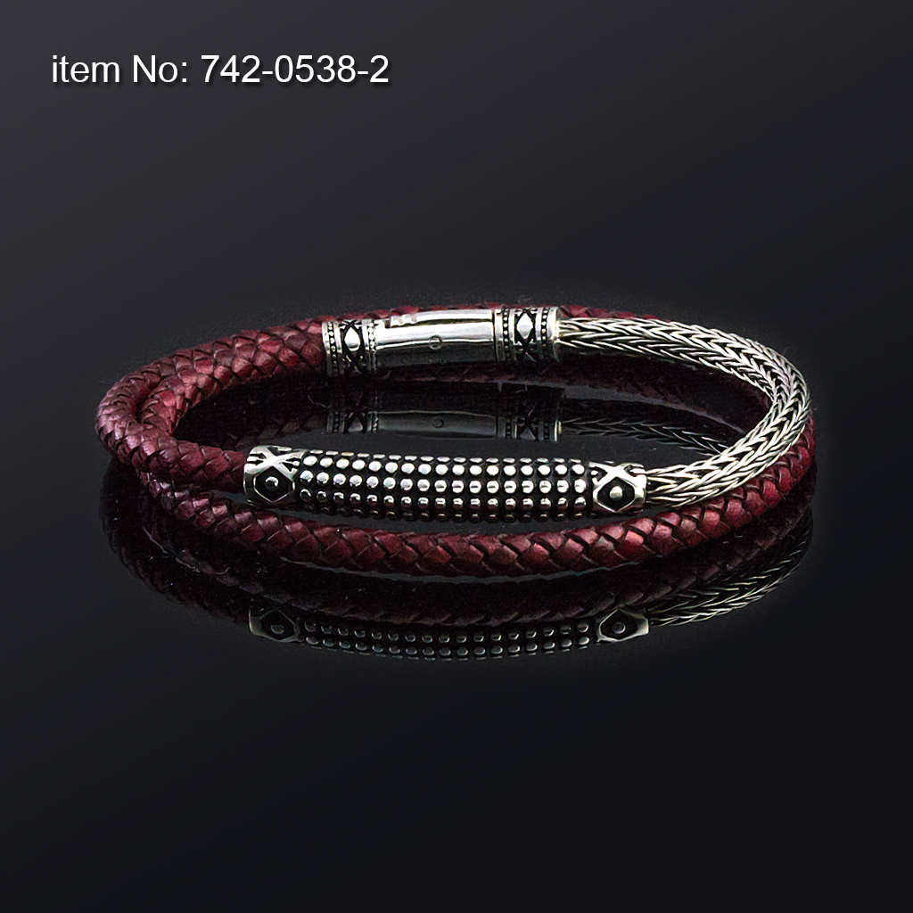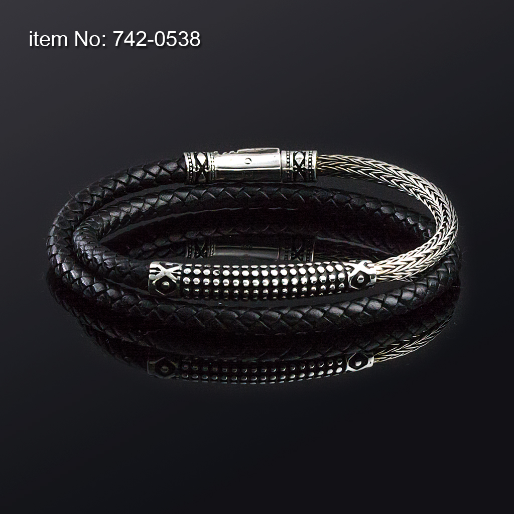 Ασημένιο διπλό βραχιόλι με μοτίφ αχινό, πλεχτή αλυσίδα και γνήσιο πλεχτό δέρμα