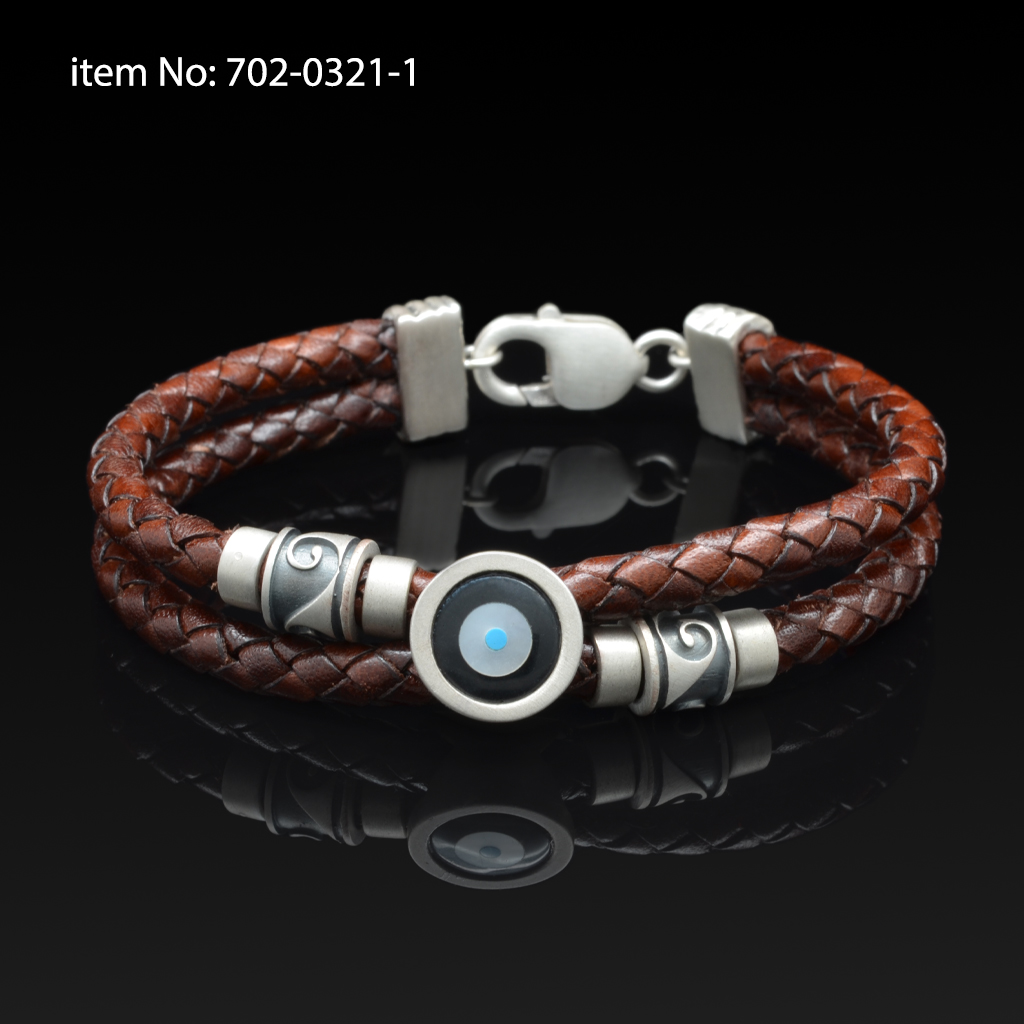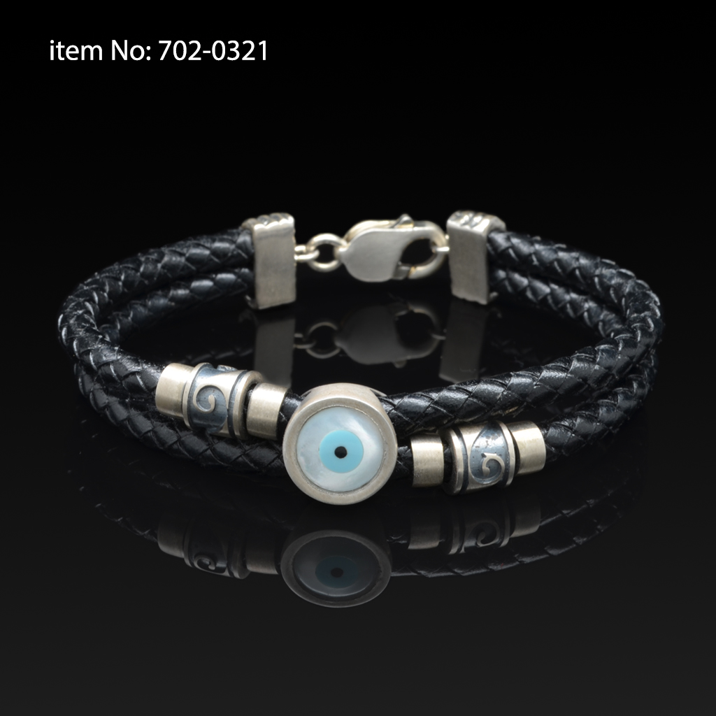 Ασημένιο βραχιόλι με μοτίφ μάτι και γνήσιο πλεκτό μαύρο δέρμα