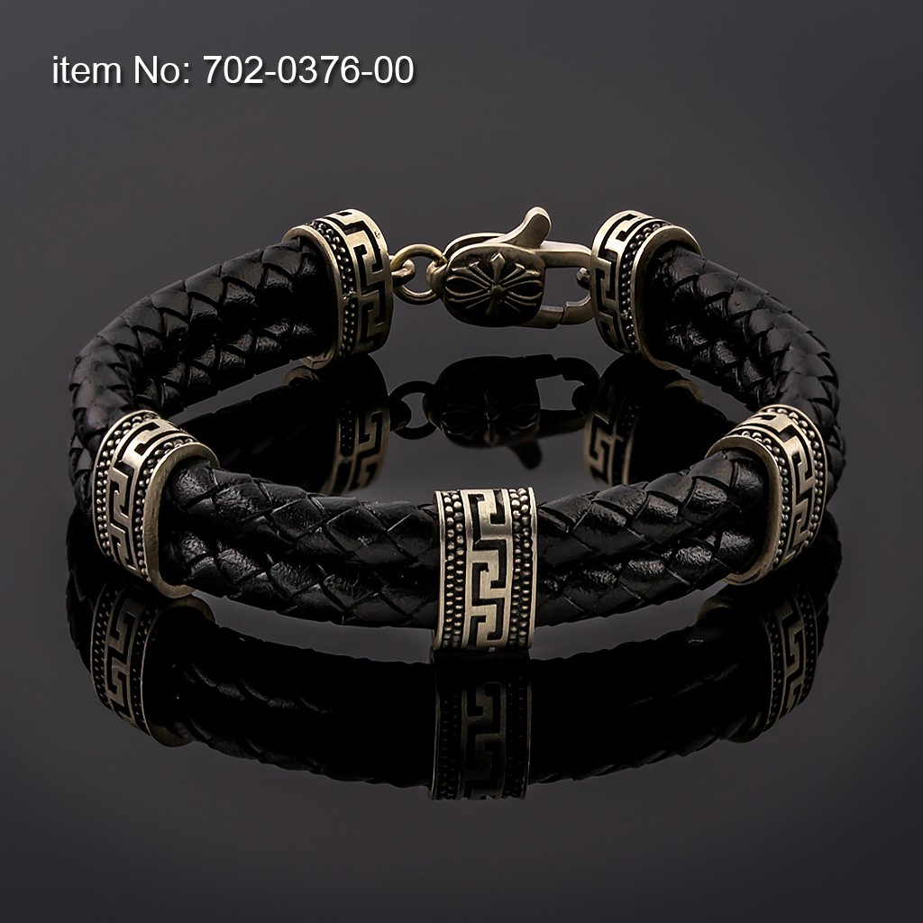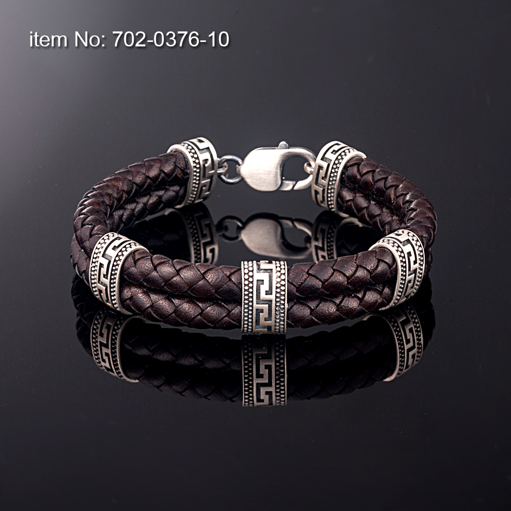 Ασημένιο βραχιόλι 925° με μοτιφ Μαίανδρο (15 mm) και με γνήσιο πλεκτό δέρμα
